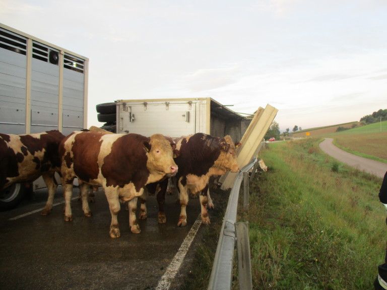 Am Montag kurz nach 06.00 Uhr ereignete sich auf der Staatsstraße 2221 bei Heroldingen ein Verkehrsunfall mit einem Viehtransporter. Ein 34jähriger Fahrer hatte mit seinem Lkw mit Anhänger Schlachtvieh eingesammelt. Auf dem Transporter befanden sich 17 Tiere. Mit seinem Gespann fuhr er von Heroldingen her nach rechts auf die Staatsstraße in Richtung Fessenheim ab. Die Geschwindigkeit war offenbar nicht angepasst und der Anhänger kippte nach links auf die Seite. Die Leitplanke verhinderte ein weiteres Abrutschen in die Böschung. Glücklicherweise kam kein Gegenverkehr, der sonst vom umkippenden Anhänger hätte getroffen werden können. Beim Eintreffen der Polizei hatten der Fahrer und die alarmierten Feuerwehren aus Heroldingen und Alerheim die Situation gut im Griff. Die 17 Tiere aus dem Anhänger konnten über das beschädigte Dach ins Freie gebracht und dort in einem abgesperrten Bereich zwischen Leitplanke und Laster eingesperrt werden. Sie hatten den Unfall anscheinend unbeschadet überstanden und wurden von Ersatzfahrzeugen des Viehhändlers abgeholt. Ihrer Bestimmung im Schlachthof konnten sie nicht entkommen. Der verunfallte Lastwagen musste abgeschleppt werden. Die Staatsstraße war für ca. 1,5 Stunden gesperrt, was sich besonders negativ auswirkte, weil diese die Umleitungsstrecke für die Baustelle in Möttingen ist. Der Schaden wird auf ca. 24.000 € geschätzt