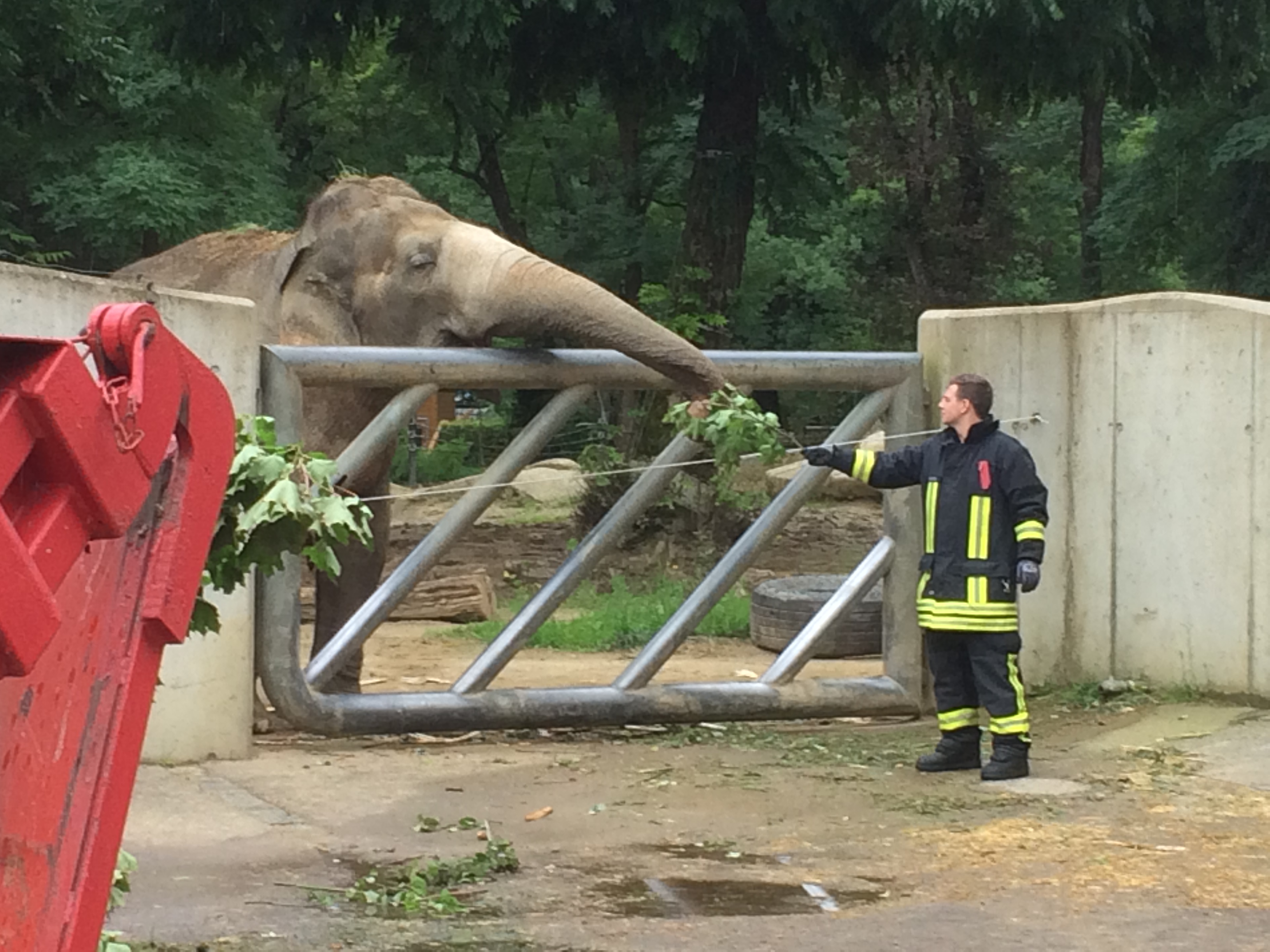 Gestern, gegen 14:15 Uhr wurde die Berufsfeuerwehr Augsburg zur Lechhauser Straße gerufen. Ein Ahornbaum wurde durch den Sturm umgeknickt und versperrte die Straße. Die Berufsfeuerwehr Augsburg und das Grünordnungsamt waren vor Ort, der Baum wurde zersägt, die Äste, Stamm wurden auf einem Wechselladerfahrzeug nach Rücksprache mit dem Grünordnungsamt zum Zoo gefahren. Elefanten haben „Spitzahornbäume zum Ausreißen“ gerne Schon bei der Zooankunft kam ein netter vielleicht noch hungriger Elefant und beobachtete seine „Ahorn-Filetstückchen“.
