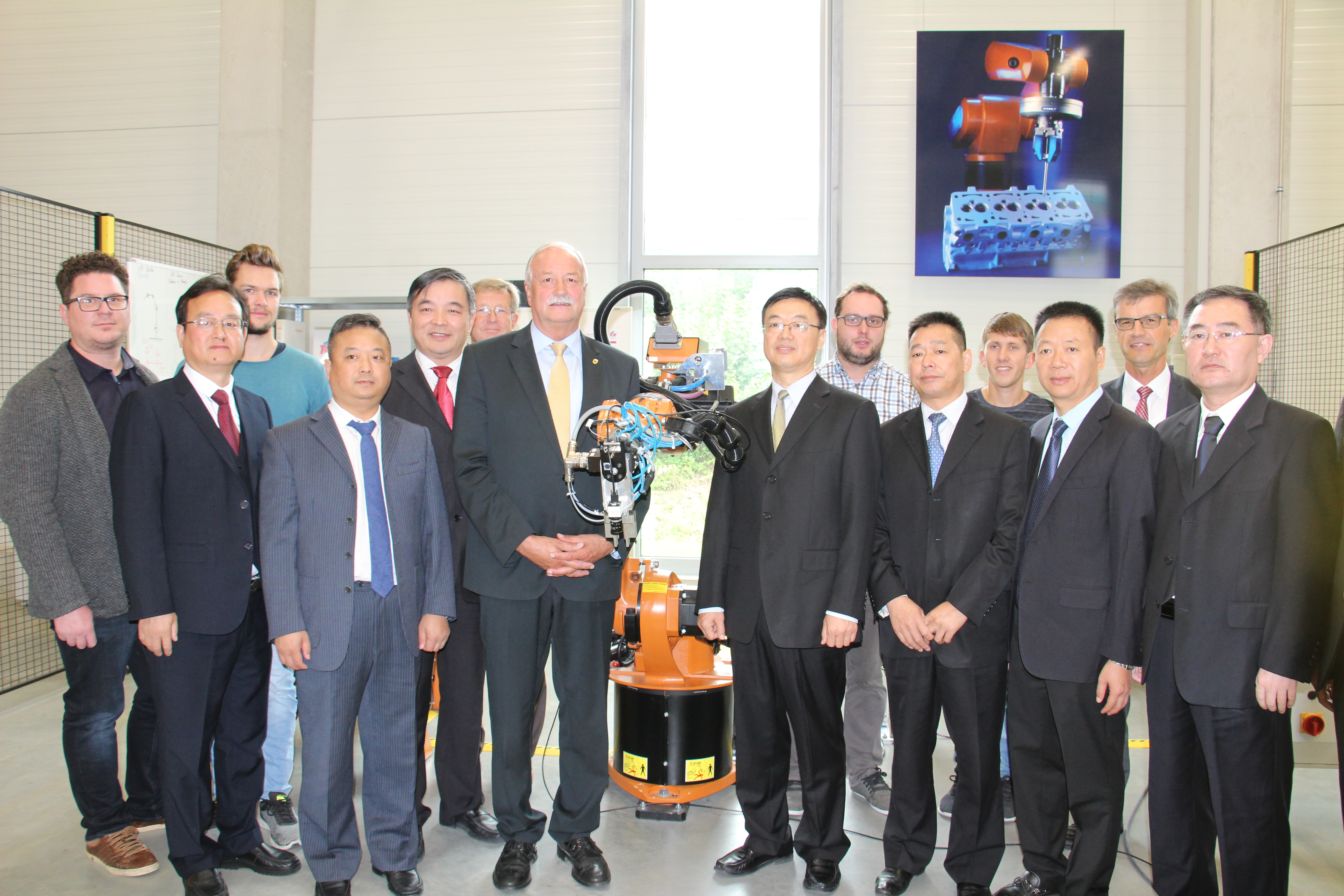 Besuch der chinesischen Wirtschaftsdelegation mit (i. d. Mitte) Oberbürgermeister Hermann Faul, (dahinter) Hauptamtsleiter Peter Schiele, (rechts neben OB Faul) Delegationsleiter Shi Yongxue, (2 v. r.) Geschäftsführer Josef Wolf, sowie den Studierenden und Mitarbeitern des TCW.