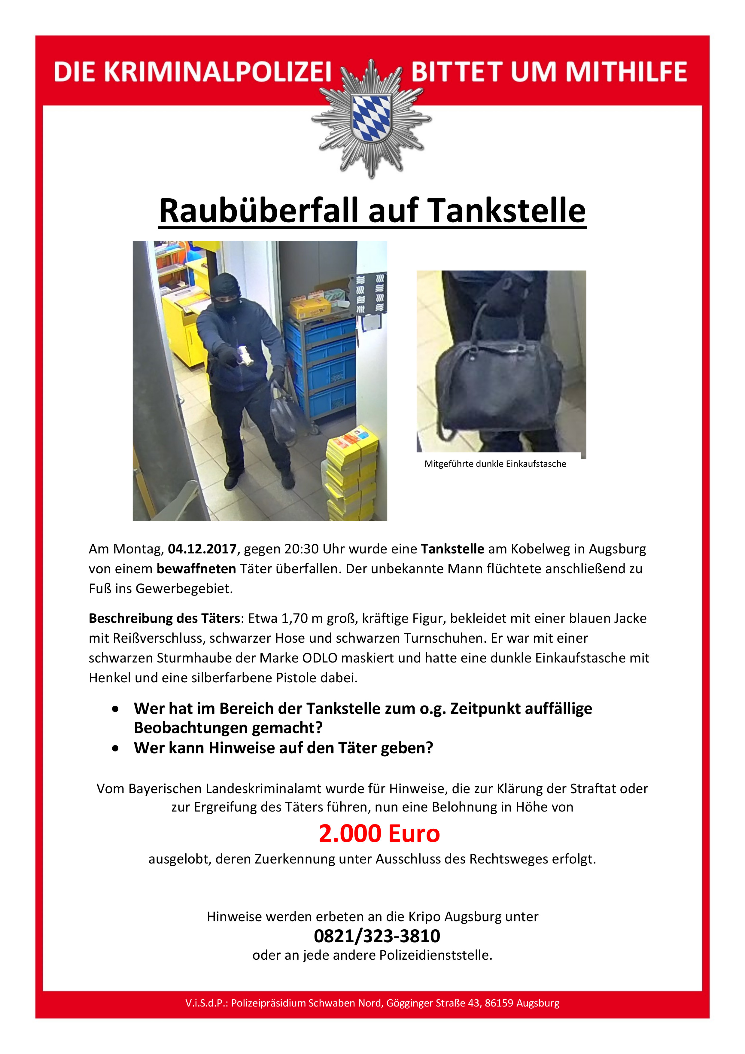 Mittlerweile wurde seitens des Bayerischen Landeskriminalamtes für Hinweise, die zur Klärung dieser Straftat oder zur Ergreifung des Täters führen, eine Belohnung in Höhe von 2.000 Euro ausgelobt. Die Zuerkennung der Belohnung erfolgt unter Ausschluss des Rechtsweges. Außerdem ist auf unserer Homepage ein Fahndungsplakat eingestellt, das den bewaffneten Täter zeigt. Das Fahndungsplakat finden Sie außerdem im Anhang zum heutigen Pressebericht. Sachdienliche Hinweise bitte an die Kripo Augsburg unter 0821/323 3810.