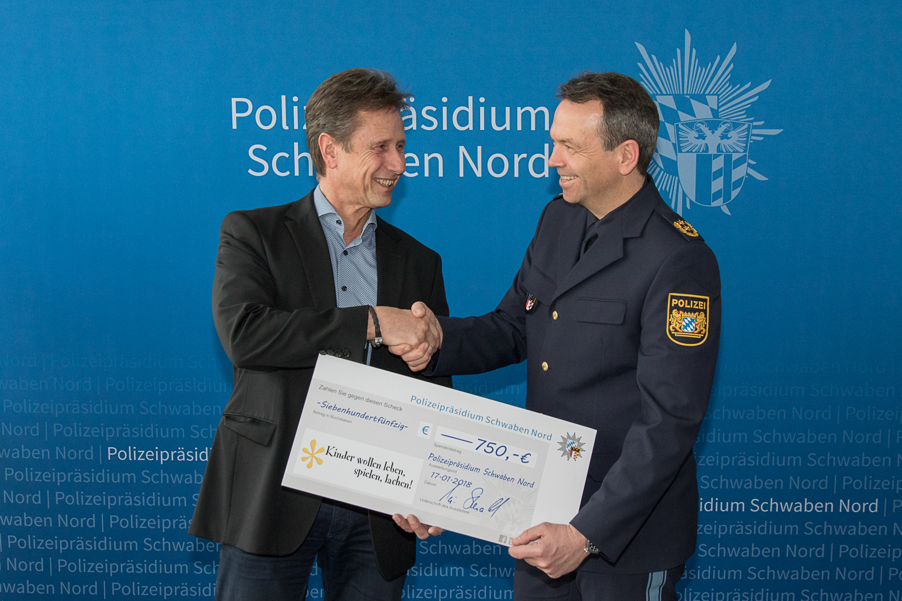 Am 14. Dezember 2017 fand im Polizeipräsidium Schwaben Nord die Weihnachtsfeier mit Jahresabschlussfeier einschließlich eines vorausgehenden ökumenischen Gottesdienstes für Polizeiangehörige und Pensionisten statt. Begleitet wird diese alljährliche Veranstaltung von einer Spendenaktion mit dem Hintergrund auch an die zu denken, denen es nicht so gut geht. Bei der Spendenaktion 2016 wurde beispielsweise das Fritz-Felsenstein-Haus in Königsbrunn bedacht. "Kinder wollen leben, spielen, lachen", dies ist das Motto und der Name eines eingetragenen Vereines, der krebs- und schwerstkranke Kinder und deren Familien unterstützt. Martin Oberman, selbst Polizist, Gründer und Vorsitzender dieses Vereines musste im Jahr 2000 die schicksalshafte schwere Erkrankung seiner Nichte selbst miterleben. Sie und andere kleine Patienten meinten immer wieder, ein Clown wäre ab und zu ganz schön, um einfach wieder lachen zu können. Daraus erwuchs der Gedanke für die Gründung des Vereins der nicht nur Klinik-Clowns engagiert, sondern die Kinder und deren Angehörige in vielfältiger Weise unterstützt. "Ich freue mich Ihnen diesen Scheck übergeben zu können weil ich weiß, dass dieses Geld zu 100% Kindern und Familien zu Gute kommt, die es wahrlich nicht leicht haben!" Mit diesen Worten übergab Polizeipräsident Michael Schwald am Mittwoch, 17. Januar 2017, im Polizeipräsidium einen symbolischen Scheck in Höhe von 750,- Euro an Martin Oberman. Der Scheck ist das Ergebnis der letztjährigen polizeilichen Spendenaktion. Geld, das gut angelegt wird, meinte Martin Oberman, der sich für die Zuwendung im Namen seines Vereins sehr herzlich bedankte. Er hatte auch schon einen Verwendungszweck parat, denn möglicherweise wird diese Spende für die Beschaffung einer speziellen Sitzschale für ein erkranktes Kind verwendet. Weitere Informationen zu diesem Verein sind im Internet unter www.kinder-wollen-leben-spielen-lachen.de ersichtlich.