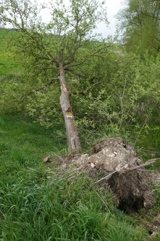 In der Zeit von Freitag 20.04., 17:00 Uhr bis Samstag 21.04., 09:00 Uhr beschädigte ein unbekannter Täter bei Sulzdorf einen Alleebaum. Es handelte sich um einen mehrere Meter hohen Birnbaum, der ca. einen Kilometer nach Fünfstetten in Richtung Heidmersbrunn am Straßenrand stand. Anhand der Spurenlage muss man davon ausgehen, dass der Baum durch eine starke Zugmaschine mit Frontlader umgedrückt wurde. Eine deutliche Kerbe in ca. zwei Meter Stammhöhe weist deutlich auf eine solche Vorgehensweise hin. Das schränkt den mutmaßlichen Täterkreis zumindest auf die Besitzer derartiger Fahrzeuge ein. Da sich landwirtschaftliche Anlieger zurückliegend bei der Gemeinde über Sichtbehinderungen aus einem Feldweg beschwert hatten, hatte die Gemeinde bereits überhängende Äste fachgerecht schneiden lassen. Umso ärgerlicher ist der jetzige Vorfall, der möglicherweise dazu dienen soll, die Landschaft vermeintlich maschinengerechter zu gestalten. Die materielle Schadenshöhe kann nicht exakt festgestellt werden. Fachgerechte Neuanpflanzungen in dieser Größenordnung liegen sicher im vierstelligen Bereich.