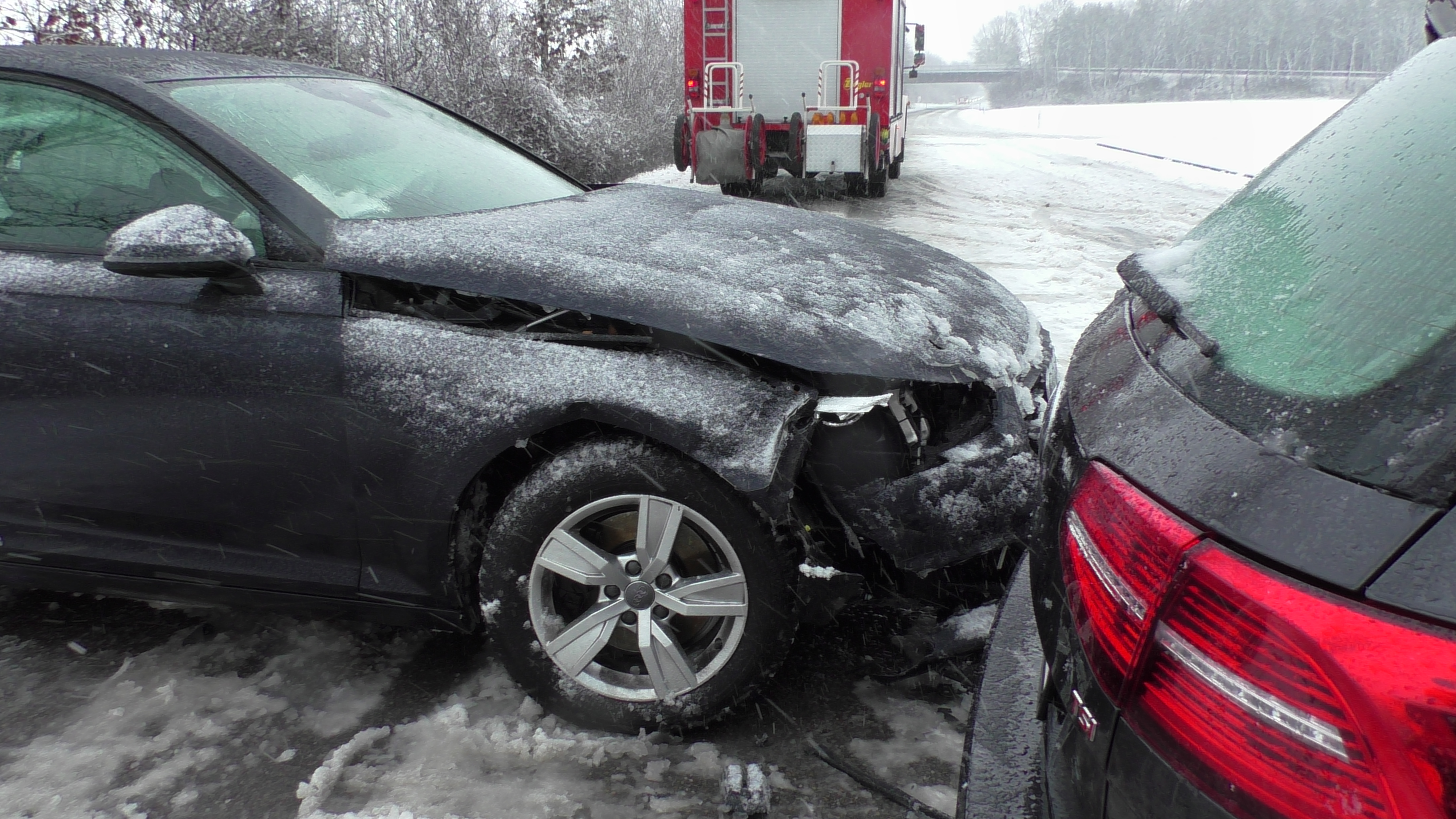 Um 10.50 h befährt eine 48-jährige Frau mit ihrem Pkw die B 16 bei Rain, Fahrtrichtung Neuburg. Sie will mit ihrem Fahrzeug Abfahrt Rain West abfahren, bremst auf der schneebedeckten Fahrbahn und kommt ins Schleudern und kommt dann auf der Fahrbahnmitte zum Stehen. Der nachfolgende 59-jährige kann mit seinem Pkw nicht anhalten. Es kommt zum Zusammenstoß. Seine 46-jährige Beifahrerin wird hierbei leicht verletzt. Der Gesamtschaden liegt bei 20.000 Euro. Während der VU-Aufnahme war die B 16 komplett gesperrt. 15 Mann der FFW Rain unterstützten die Polizei. Beide Fahrzeuge mussten abgeschleppt werden.