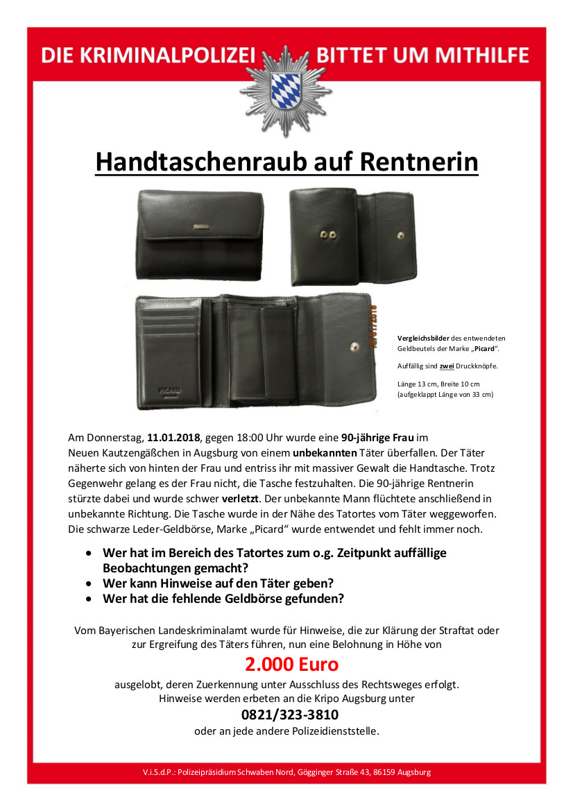 Mittlerweile wurde seitens des Bayerischen Landeskriminalamtes für Hinweise, die zur Klärung dieser Straftat oder zur Ergreifung des Täters führen, eine Belohnung in Höhe von 2.000 Euro ausgelobt. Die Zuerkennung der Belohnung erfolgt unter Ausschluss des Rechtsweges.