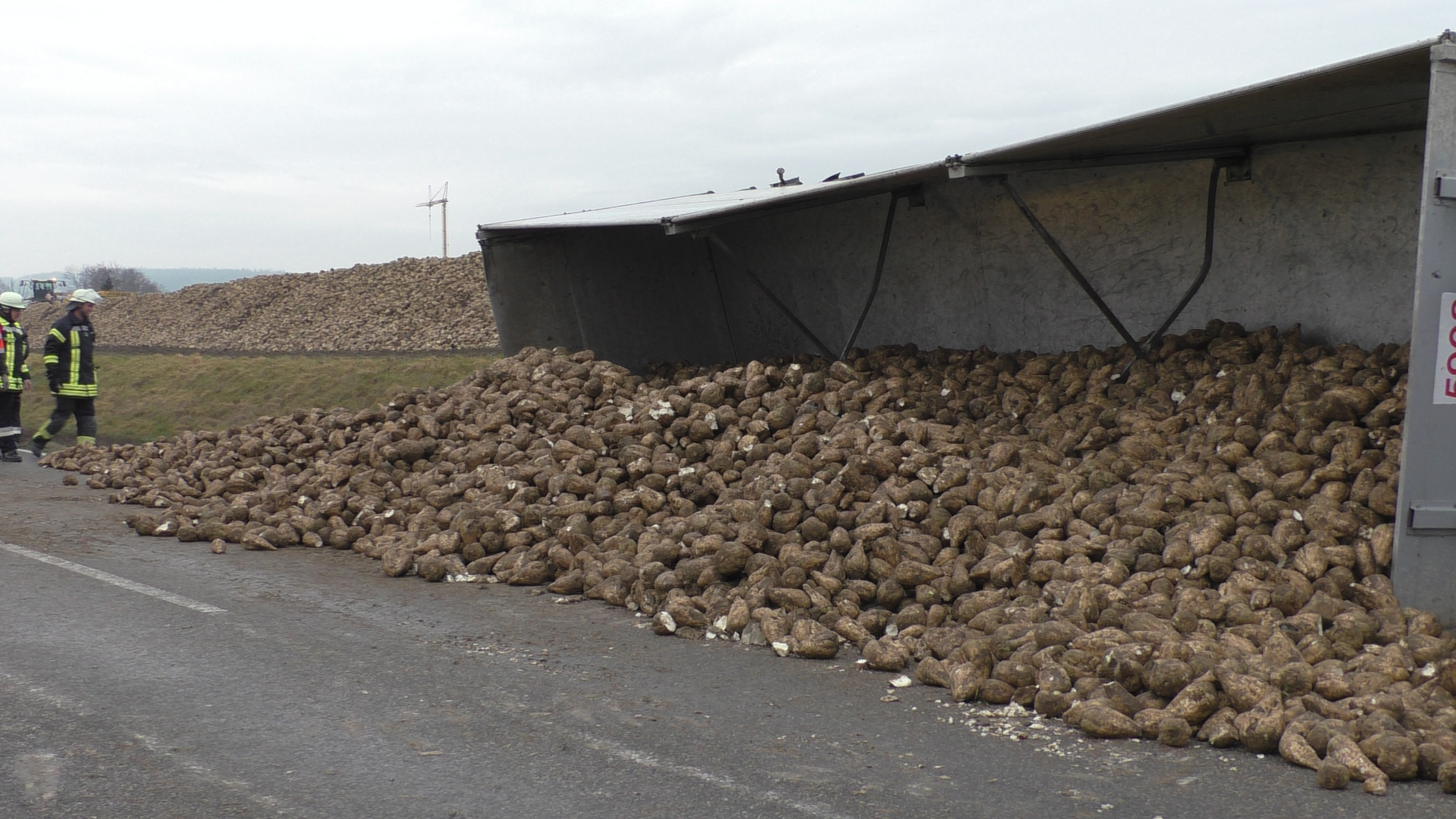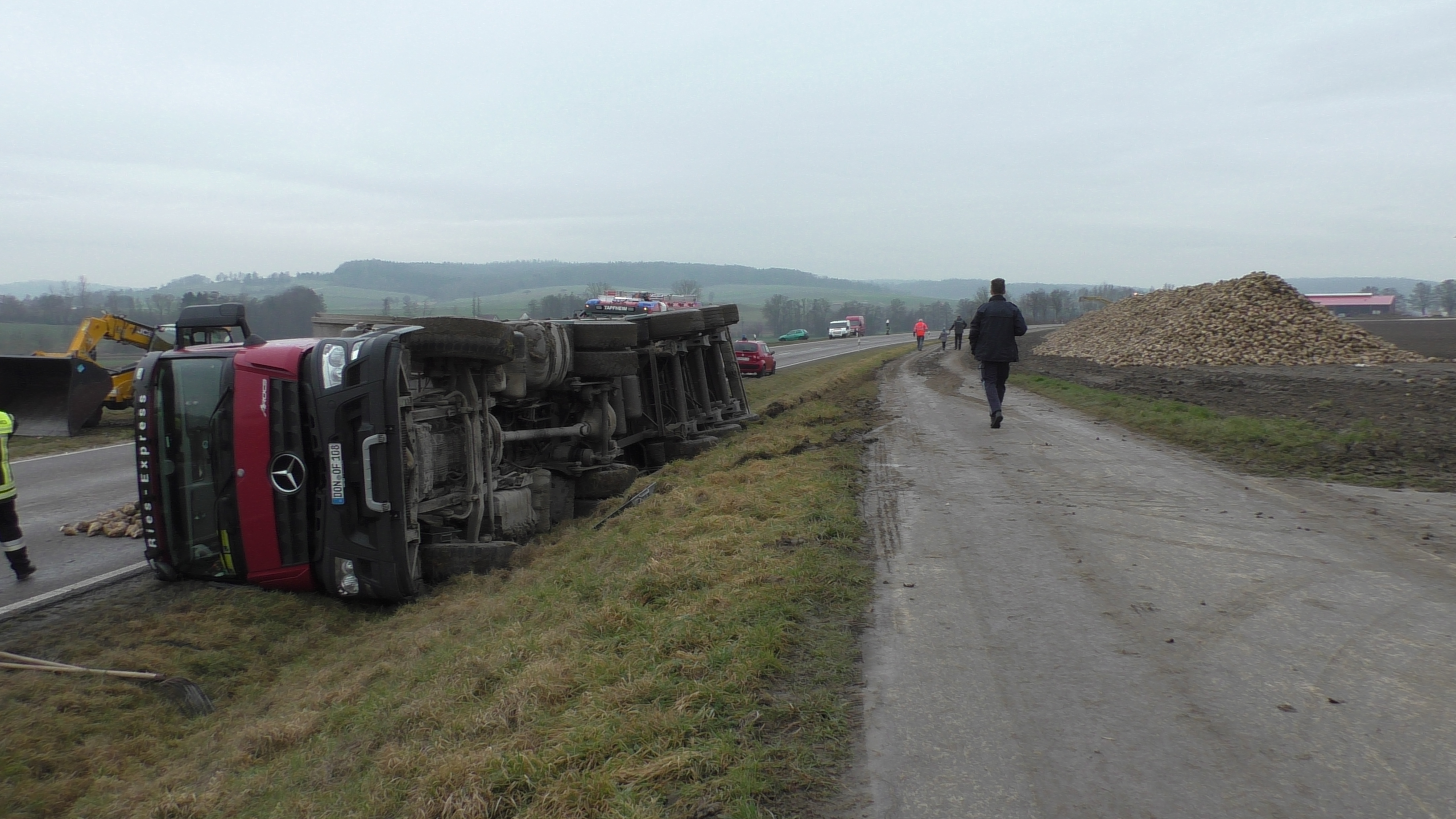 Zu einem Unfall mit hohem Sachschaden kam es am Mittwoch gegen 14.00 Uhr an der Staatsstraße zwischen Erlingshofen und Brachstadt. Auf dem parallel verlaufenden Radweg war ein Rübentransporter von der Rübenmaus beladen worden. Wegen des regnerischen Wetters war der Radweg entsprechend verschmutzt und rutschig. Als der 62jährige Lastwagenfahrer voll beladen wegfuhr kam er auf der leicht abschüssigen Strecke ins Rutschen. Laster und Ladung gerieten auf das Bankett zwischen Radweg und Straße und kippten schließlich nach rechts um. Ein Teil der Zuckerrüben rollte auf die Fahrbahn. Der Fahrer verletzte sich bei seiner Viertel-Drehung leicht. Andere Verkehrsteilnehmer waren in das Unfallgeschehen nicht verwickelt. Zur Bergung von Ladung und Fahrzeug war die Staatsstraße bis ca. 17.30 Uhr gesperrt. Die Feuerwehren aus Tapfheim und den Ortsteilen waren mit ca. 30 Mann an der Unfallstelle. Wegen ausgelaufener Betriebsstoffe veranlasste die Straßenmeisterei einen Bodenaustausch. Der Sachschaden wird auf ca. 76.000 € geschätzt.