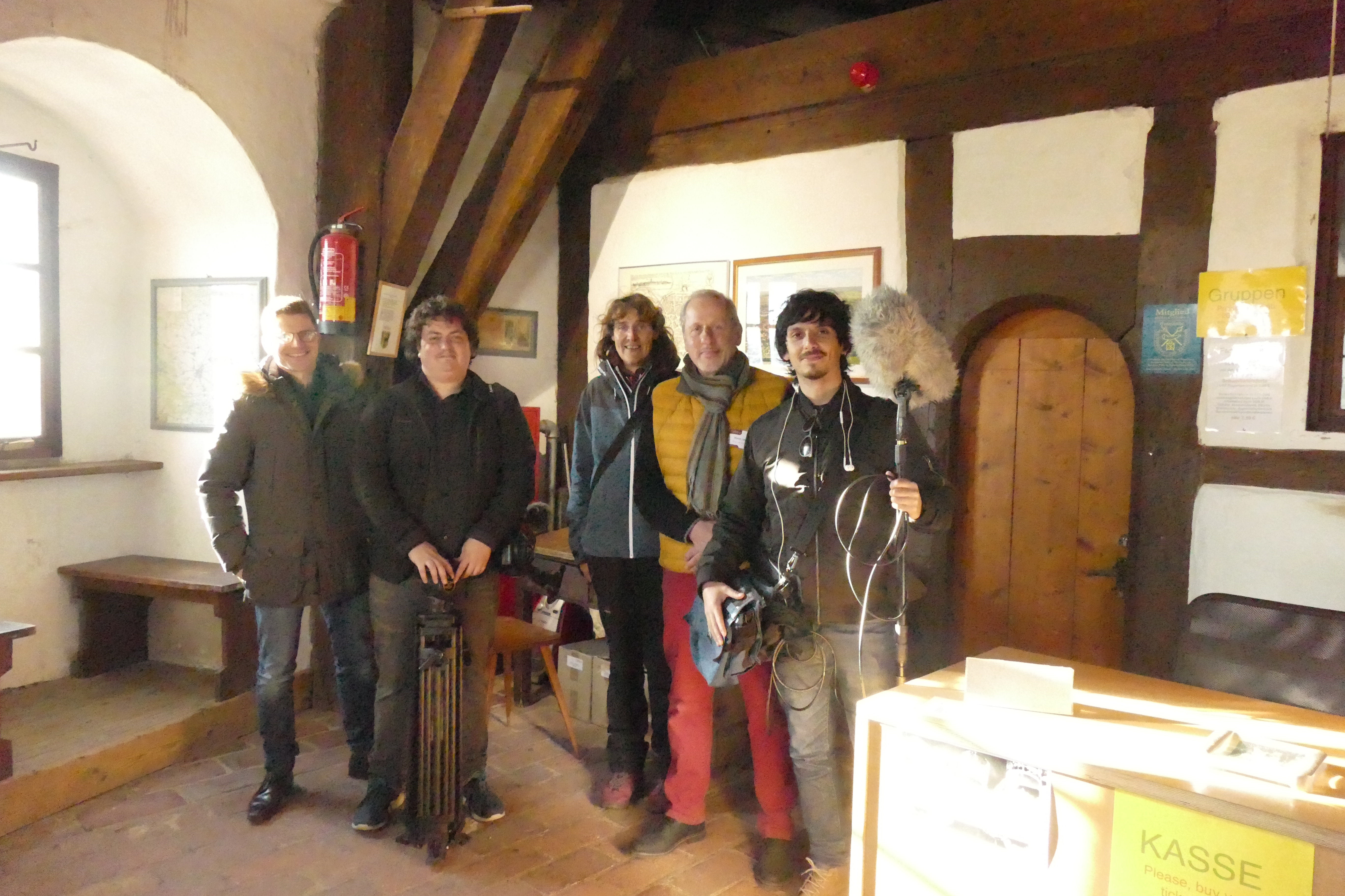 David Wittner (Chef der Tourist-Information Nördlingen), Horst Lenner (Türmer), Gisela Pösges (Geopark-Geologin), Diego Breit und David Guzmán von Glaciar-Films, CNTV Chile