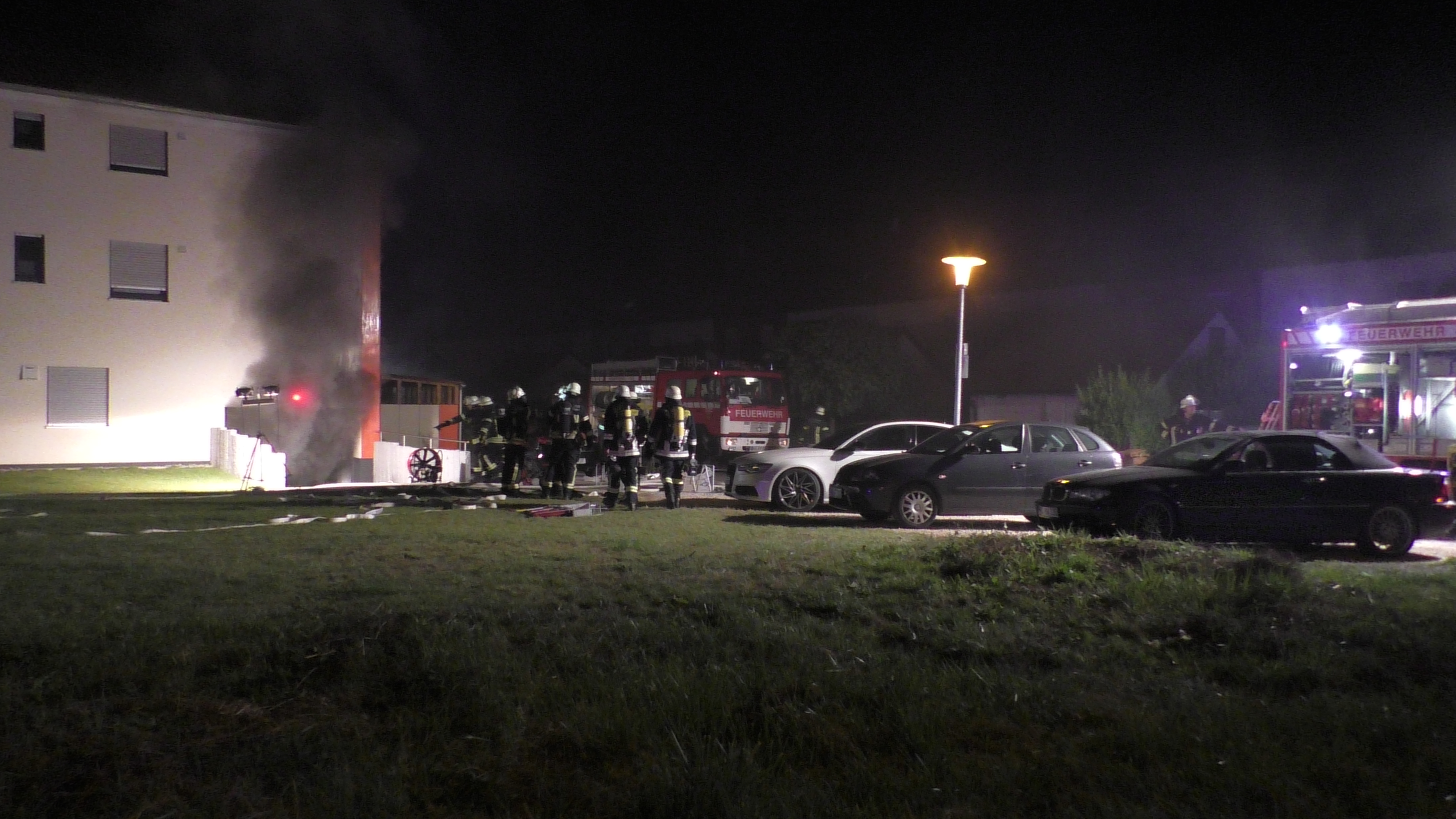 Am Mittwoch, den 18.09.2019 gegen 21:50 Uhr wurde der Integrierten Leitstelle der Feuerwehr eine starke Rauchentwicklung aus einer Tiefgarage gemeldet. Bei Eintreffen der Einsatzkräfte drang starker Rauch aus sämtlichen Lüftungsschächten der Tiefgarage unterhalb des Wohnkomplex Maria-Holl-Straße 6 und 8. Zur Brandbekämpfung war die Feuerwehr mit schwerem Atemschutz in der Tiefgarage bis die Löscharbeiten aufgrund Einsturzgefahr eingeschränkt werden musste.